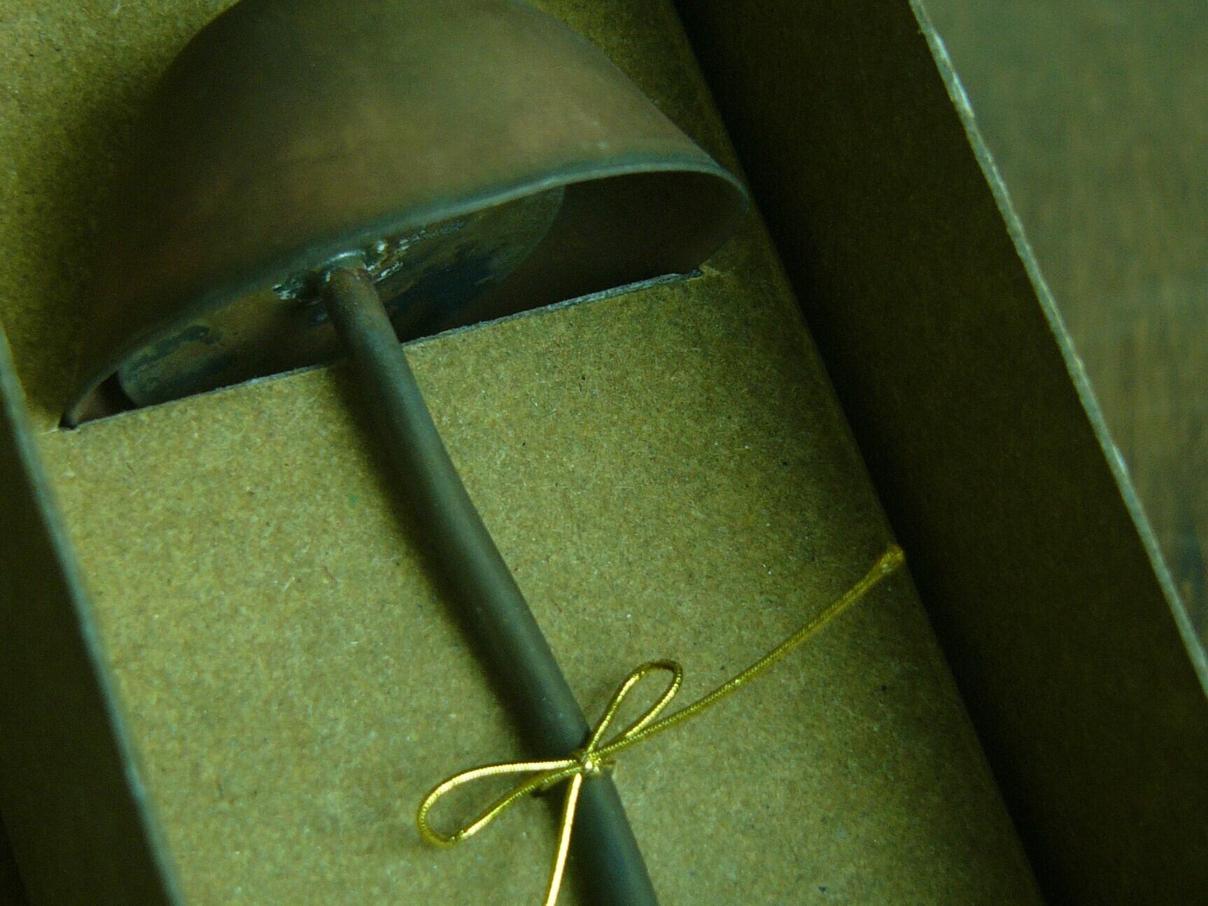 とある夏に風鈴展に参加しませんか?とお誘いいただいたことがきっかけで考案した 真鍮製のきのこのふうりん。すでにキノコの画鋲を作っていたので、自然と頭に浮かんできて 製作しました。実在するキノコ”シバフタケ”をイメージしています。 風鈴を収める化粧箱には自作の活字で箔押しした文字がきらめいています。