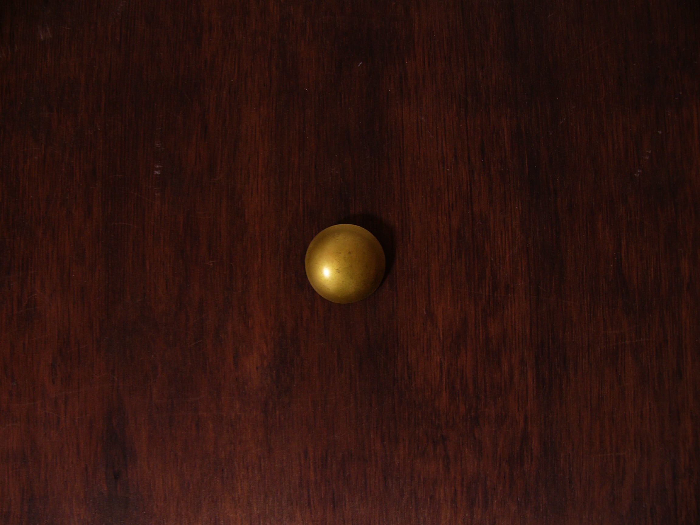 真鍮の板をまん丸く成形したブローチ。黒染めの模様入りと無地の2種類があります。成形の前に板を柔らかくするため、ガスバーナーで真っ赤に熱するのですが、その時に板の表面は不思議な具合に曇ります。無地はその表情のままでブローチに。黒染めはそこから研磨しピカピカにした後、模様をいれてから丸く成形します。裏側は放射状のヘアライン仕上げとなっています。